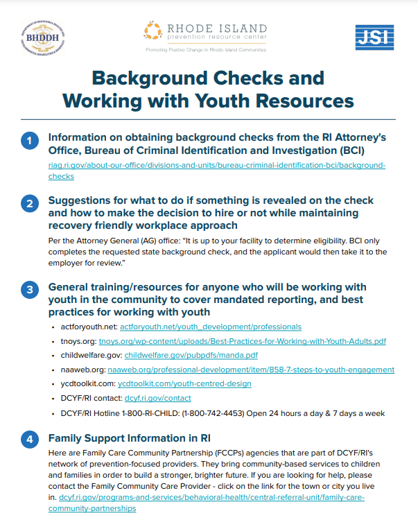 This is a 3-part webinar from Northeast & Caribbean ATTC on November 13, 17, and 20 from 10:00am-12:00pm Eastern Time. Participants will discuss core components of motivational interviewing and enhancing […] Monthly Coalition Meeting on the 3rd Monday of the month at 3PM except for holidays that fall on a Monday. Please contact Natalie Kimmerlein (nkimmerlein@risas.org) for more information.  |