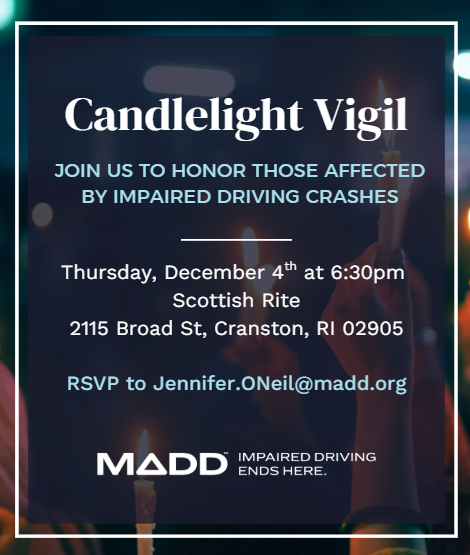 Mothers Against Drunk Driving Rhode Island is hosting their Annual Candlelight Vigil on December 4th. Each year, this special event brings together victims, survivors, families, and community partners to honor those impacted by impaired driving and to stand united in hope and remembrance.